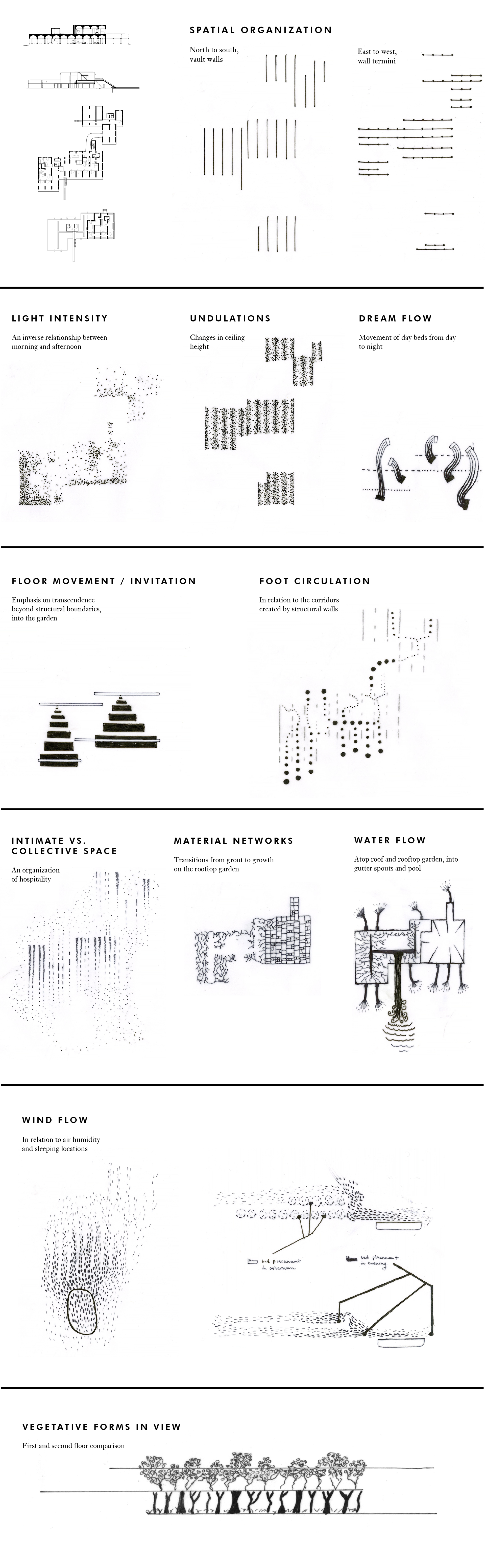 These diagrams explore how the formal characteristics of Le Corbusier’s Villa Sarabhai influence the spatial, social, and environmental phenomena on site. Located in Ahmedabad, India, Villa Sarabhai represents a work by Le Corbusier that is particular attuned to climatic conditions and fluctuations; namely, stifling daytime heat and refreshing night breezes.Â
