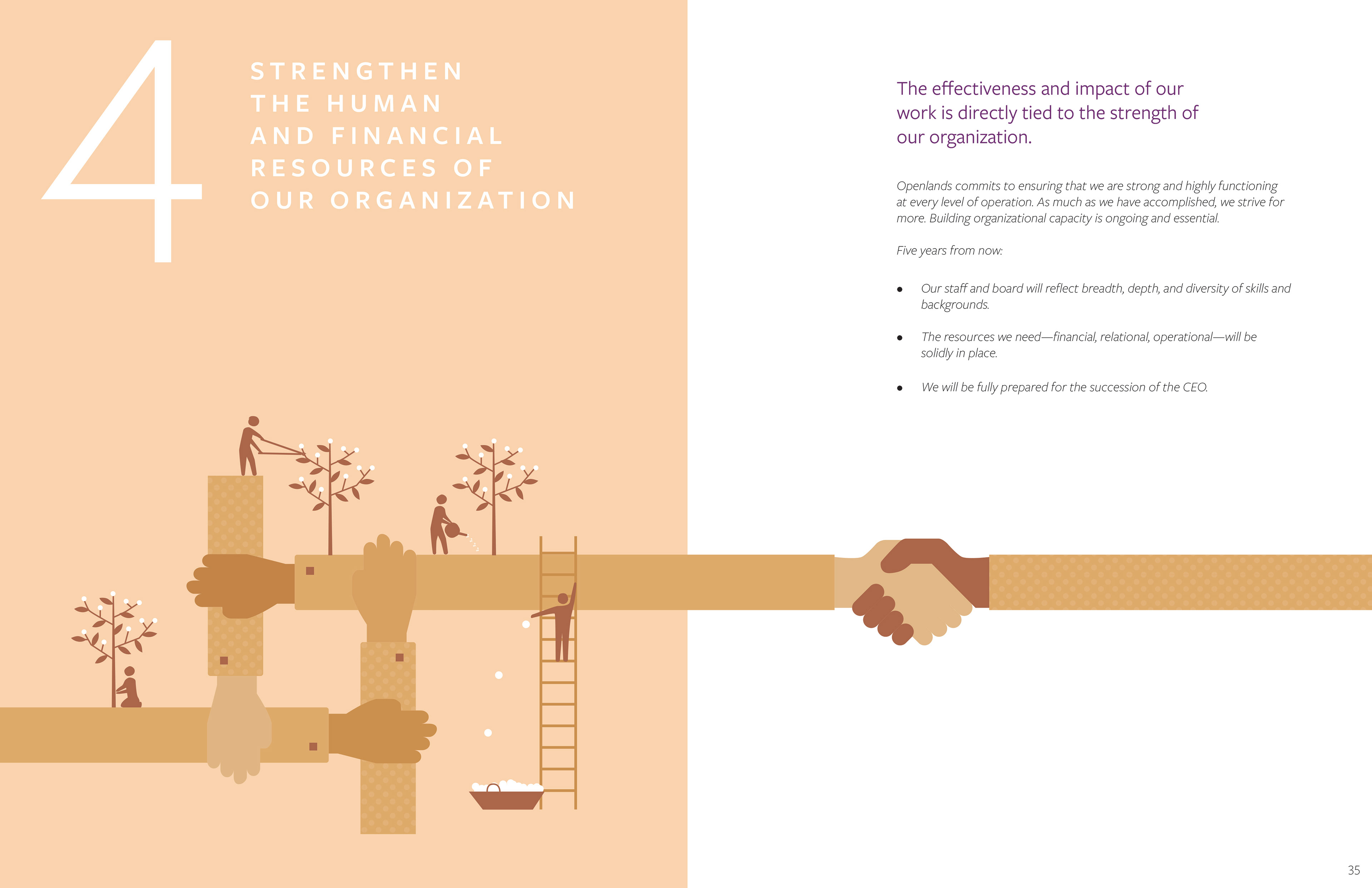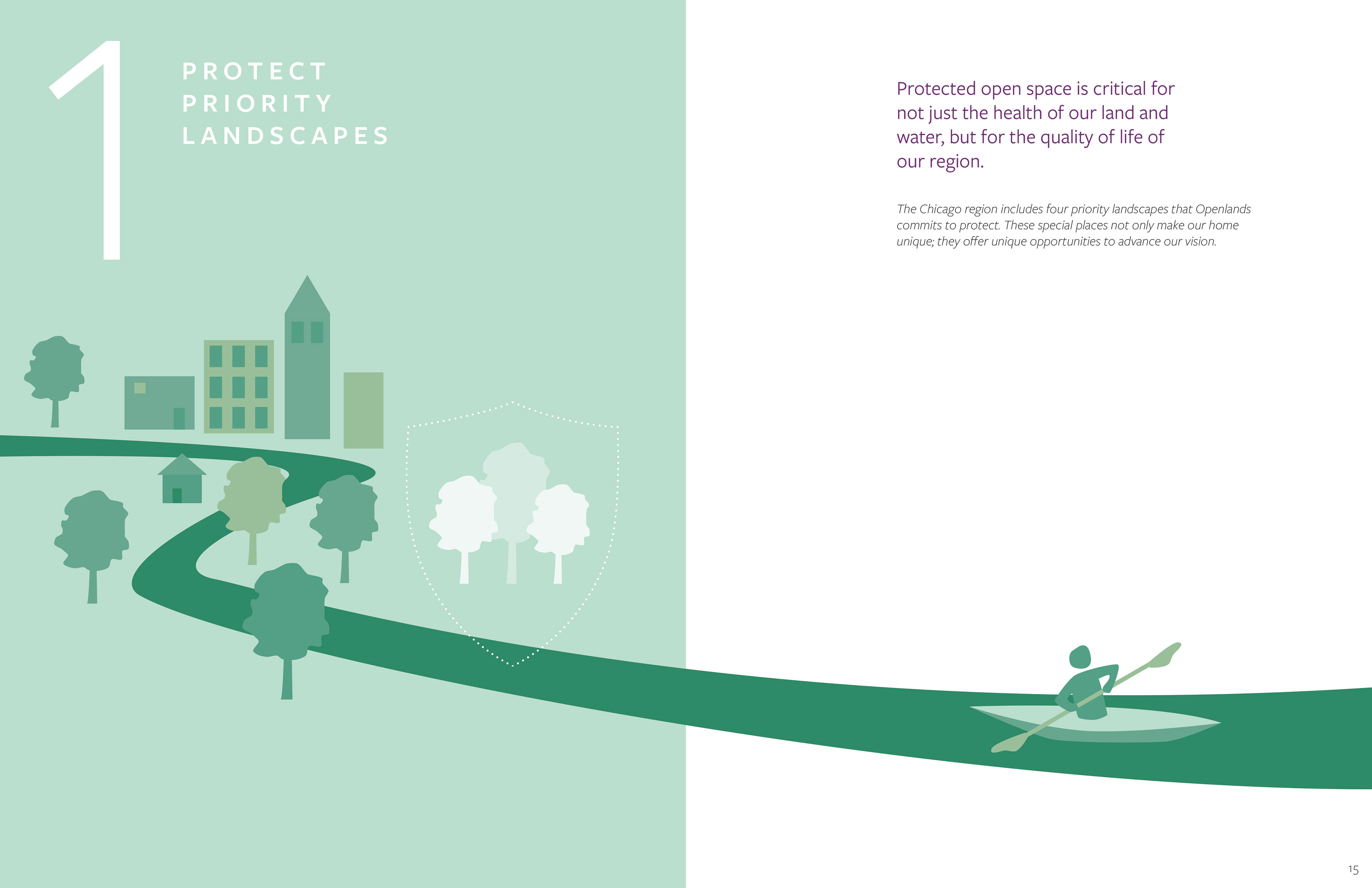 Openlands is a Chicago-based environmental non-profit advocating for open space and healthy environments in the greater metropolitan region. In 2018, they approached me to design custom graphics for their upcoming 2018-2022 Strategic Plan. This ambitious plan places public education and climate change initiatives at the center of their advocacy work over the next four years. Capturing their vision in these pages was an absolute pleasure.