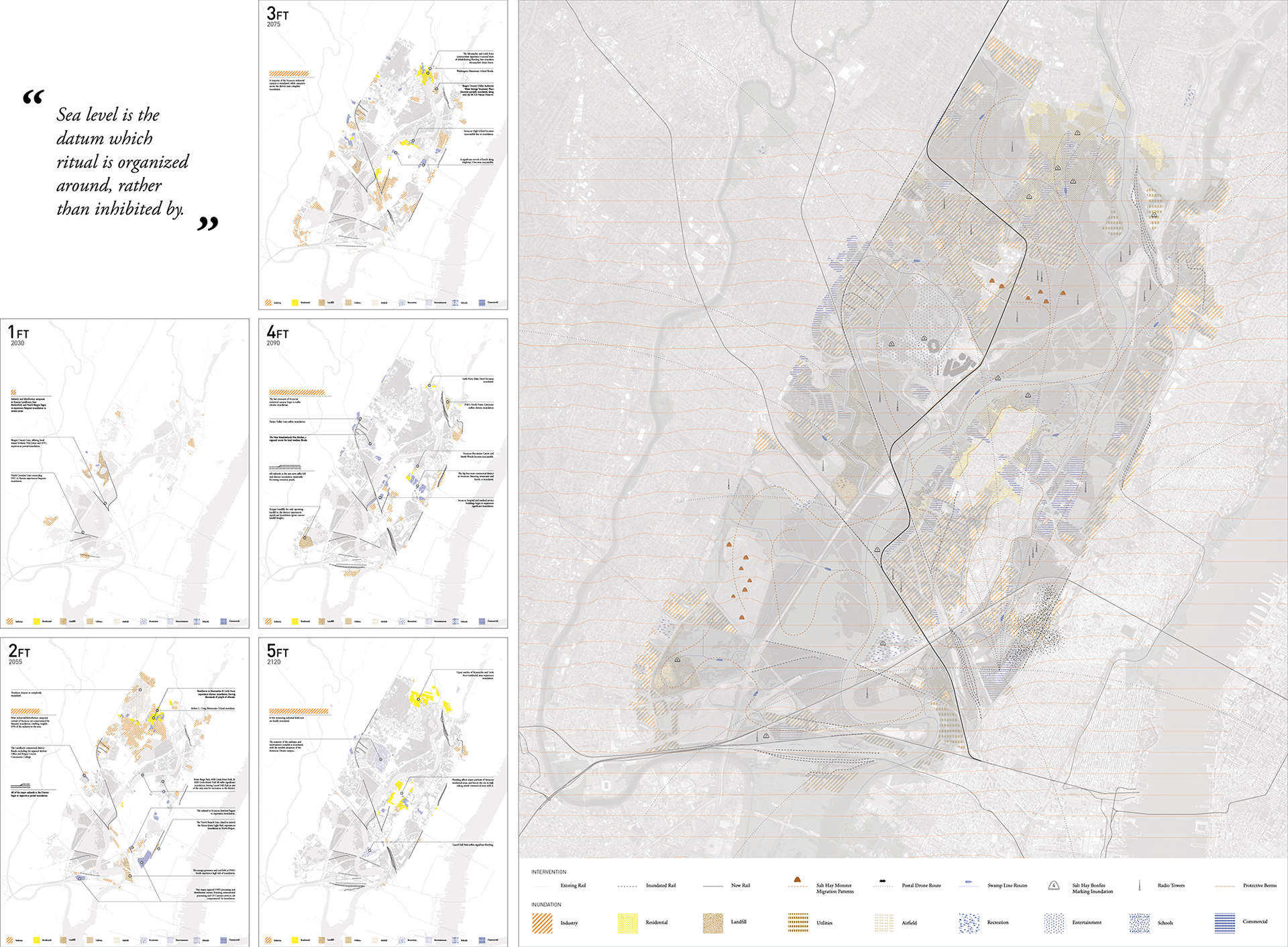Through a deep understanding of the site’s rich history, immense complexity, and tangled web of stakeholders—past, present, and future—we see an opportunity to intervene using the devices of storytelling. Our project meditates on the social characteristics of resiliency for a region in transition, using narrative as a communicative device. Through distinct insertions and ambiguous provocations about life in the future Meadowlands, we encourage community members to fill in the blanks, writing and enacting their own stories based on our initial excitation. Unfolding in small moments or over decades, these interventions generate a proliferation of futures for the Meadowlands, grown in the generative incubator of rich community dialogue, housed in mascots, prophecies, landmarks, and legends, and engaged with through the practice of everyday rituals. Sea level is the datum which ritual is organized around, rather than inhibited by.