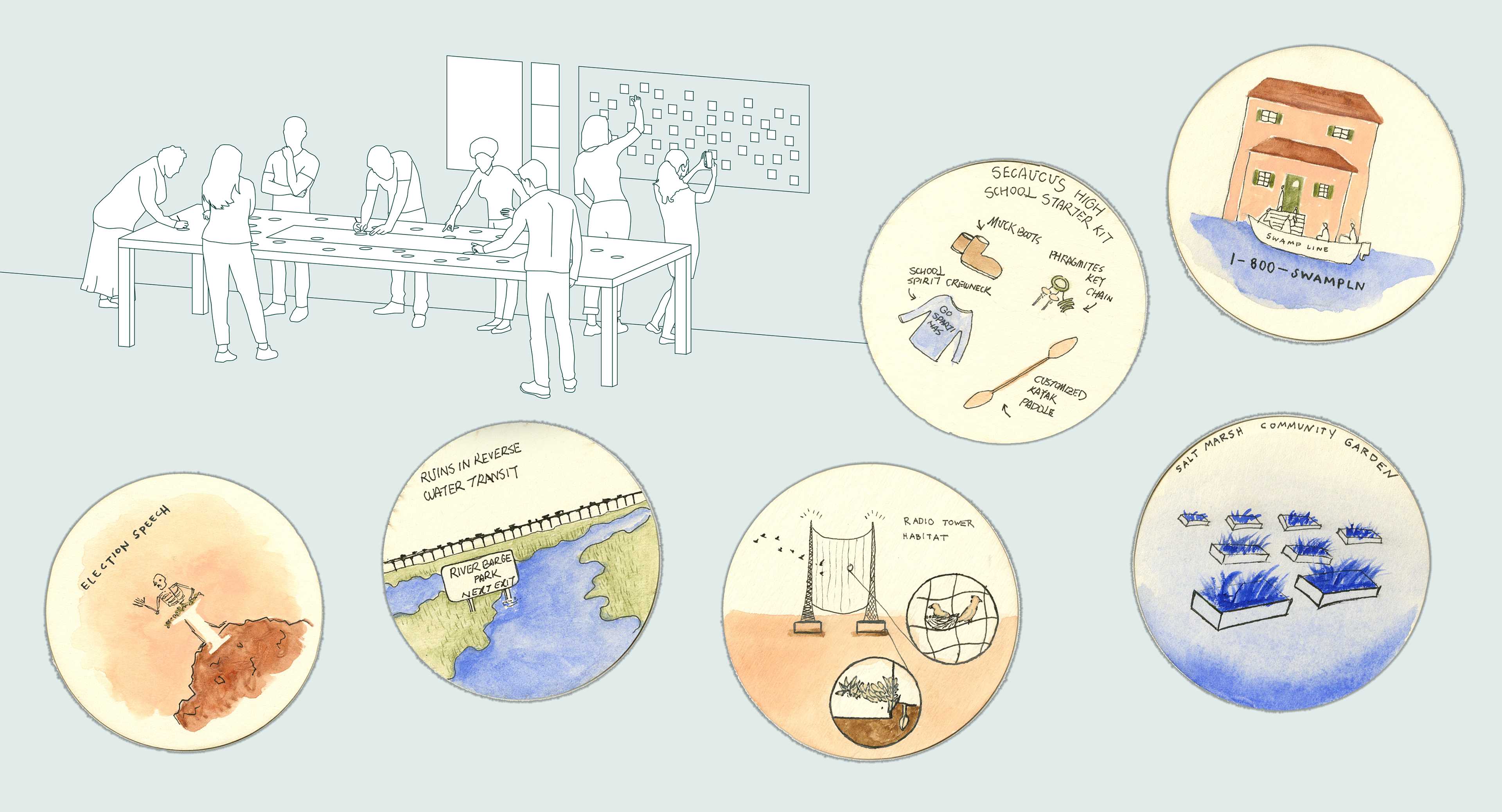 The central communicative tool of our project is the atlas, which features a set of speculative vignettes depicting interchangeable, interrelated scenarios ranging from the mundane to the fantastical. The vignettes are illustrated in such a way as to invite community members to make their own, and are meant to be arranged along a central axis depicting the psychogeographies of the Meadowlands as it transitions through sea level rise.