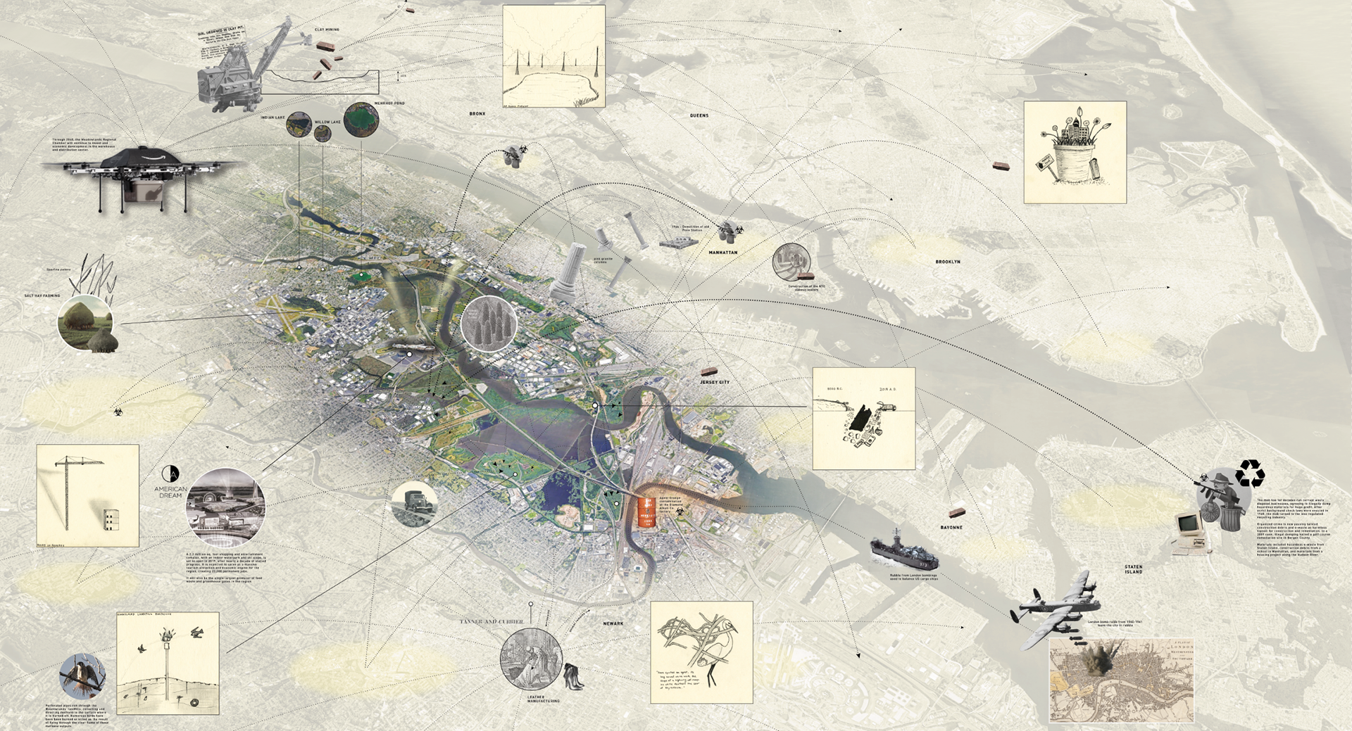 The New Jersey Meadowlands, despite decades of neglect and overdevelopment, remains the largest wetland system in the NY-NJ-CT region. It is also likely to be one of the first places to be permanently inundated from sea-level rise. Storm surges and rising seas threaten to subsume thousands of acres of marsh and developed land and to disrupt the transportation and industry of the entire region. The Regional Planning Association has recommended a national park designation for the Meadowlands that will help preserve and restore its natural habitats, protect nearby communities, and expand recreational resources for the entire region, thereby establishing the first national park for climate resilience. It is from this prompt that our project departs.