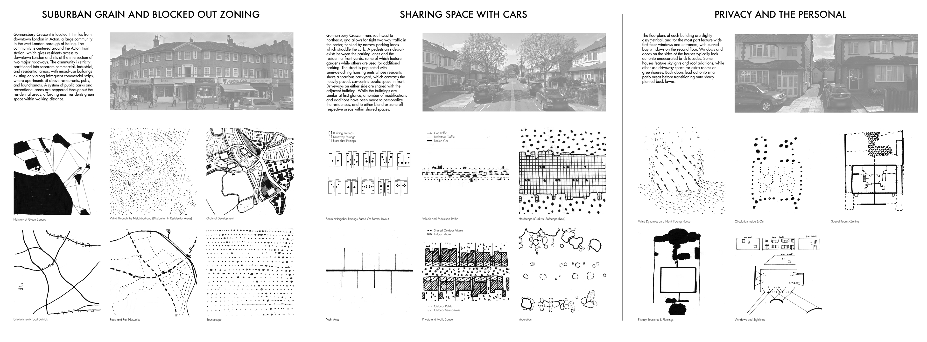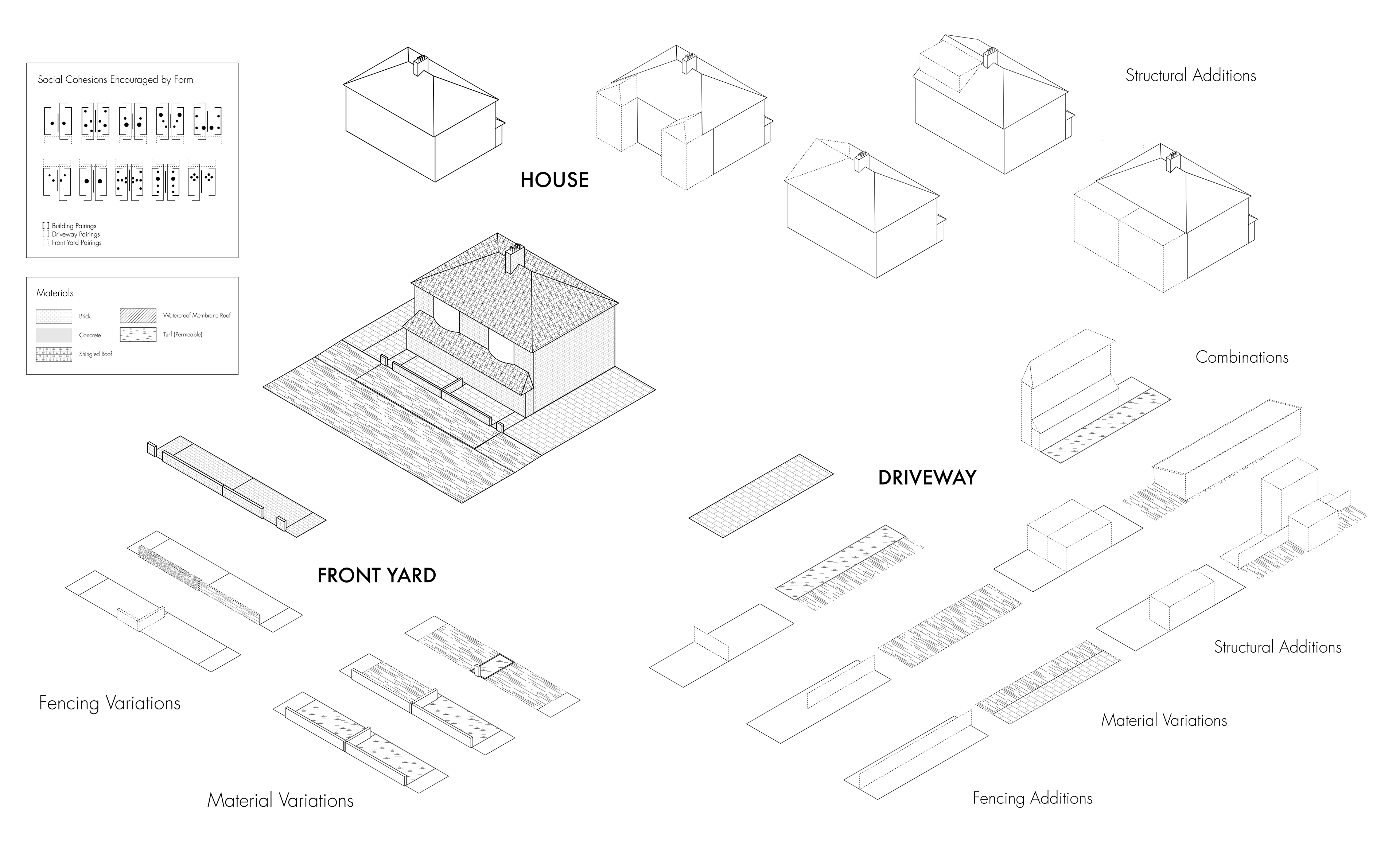 The map above charts how historic tributary routes have informed and become embedded within the city’s urban form. The subsequent explorations below catalogue material idiosyncrasies within London’s monotonous, car-centric suburbs, and serve as a launching point for designs which reframe atomized neighborly relationships around more permeable, pedestrian-friendly shared spaces.