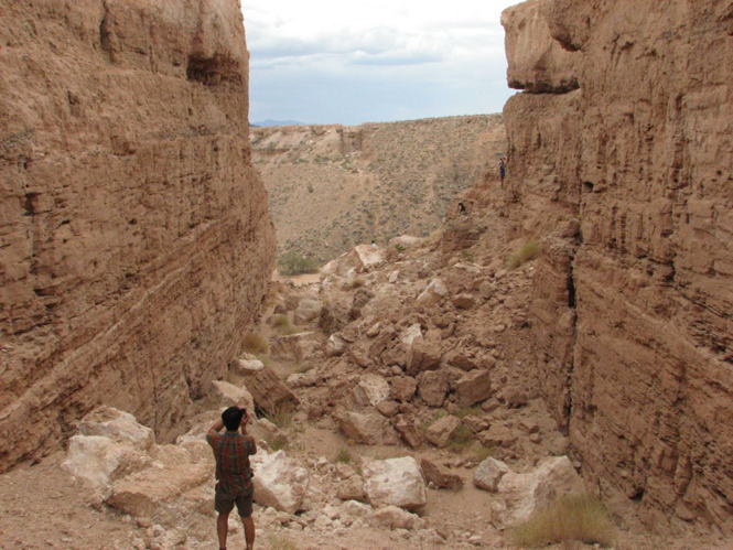 Physically, the 50-foot high walls of the trenches expose the sedimentary geology of the mesa—a layered history book of the site’s development since the Pliocene, with stories of creek beds, vegetation, erosion, and volcanoes (Brock & Buck, 2008). The outpouring of excavated sandstone and rhyolite down the hill reinforce these narratives, and as we encounter this deep geological past, our sense of time is dramatically stretched. We begin to feel the power of something ancient and pre-human—a feeling which is dramatically amplified by the piece’s ingenious composition. The implied cohesion between the trenches, bridging the enormous gap of the mesa, creates a virtual presence in the mind that flickers in and out of view. As we work to see the thing which is not there, we are confronted with an absence of monumental proportions. It is the immensity of this absence, the unavoidable weight and uncanny presence of it, that makes Double Negative so powerful.